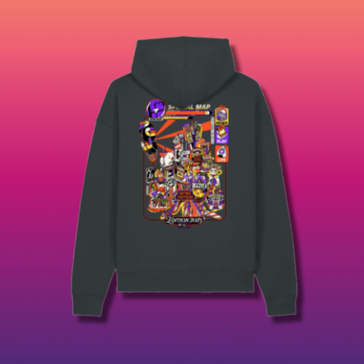 Pièce phare de la collection, ce sweatshirt à capuche à coupe moderne de couleur noire met à l’honneur l’univers graphique de PAIHEME, qui signe pour cette édition de la Paris Games Week 2025 un artwork original.
